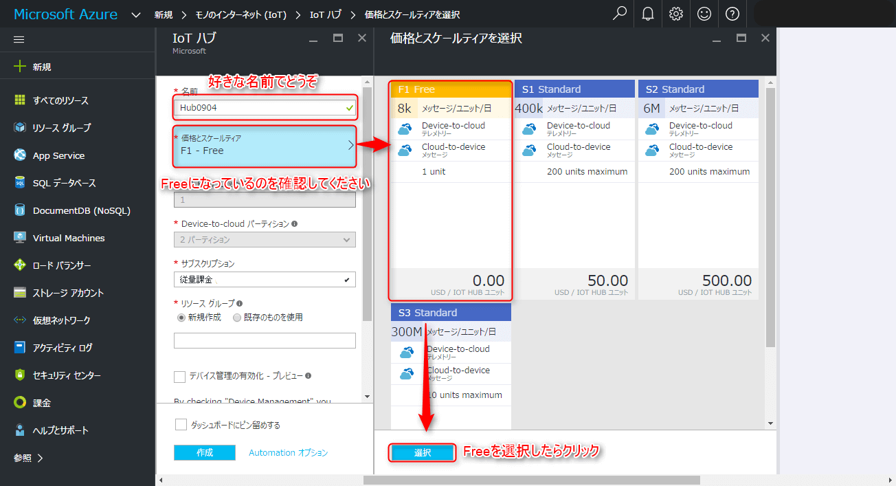 次に、価格とスケールティアを変更していきます。この際にFreeを必ず選んでください。Standardを選んだまま作成してしまうと、後からFreeに変更することができず、再度作り直すことになります。