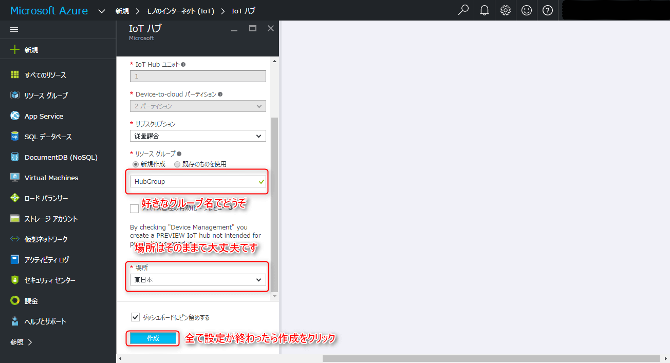 無事にIoTHubが開かれると複数の入力欄が出るので写真を参考に入力欄を埋めていきましょう。