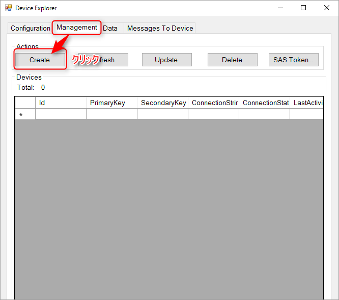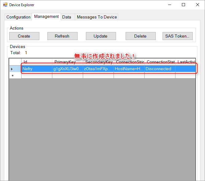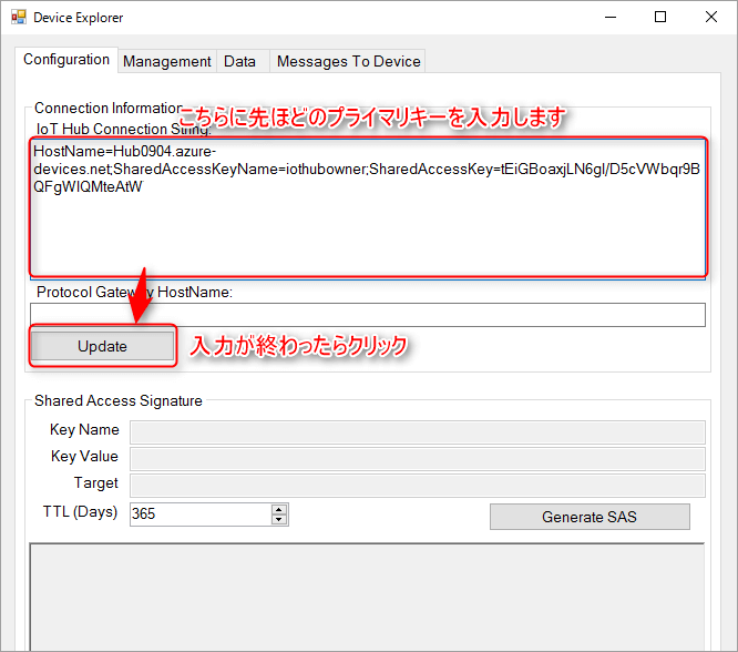 説明が長くなりましたが、それではこのDevice Explorerに先ほどのプライマリキーを入力してUpdateをクリックしてください。