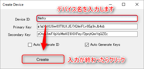 Createをクリックするとこのような画面が出ますので、Device IDに接続するデバイス名を入力してください。