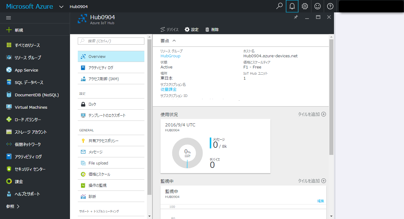 この画面では先ほど設定した内容が見れるほか、IoTHubの使用状態を確認することができます。