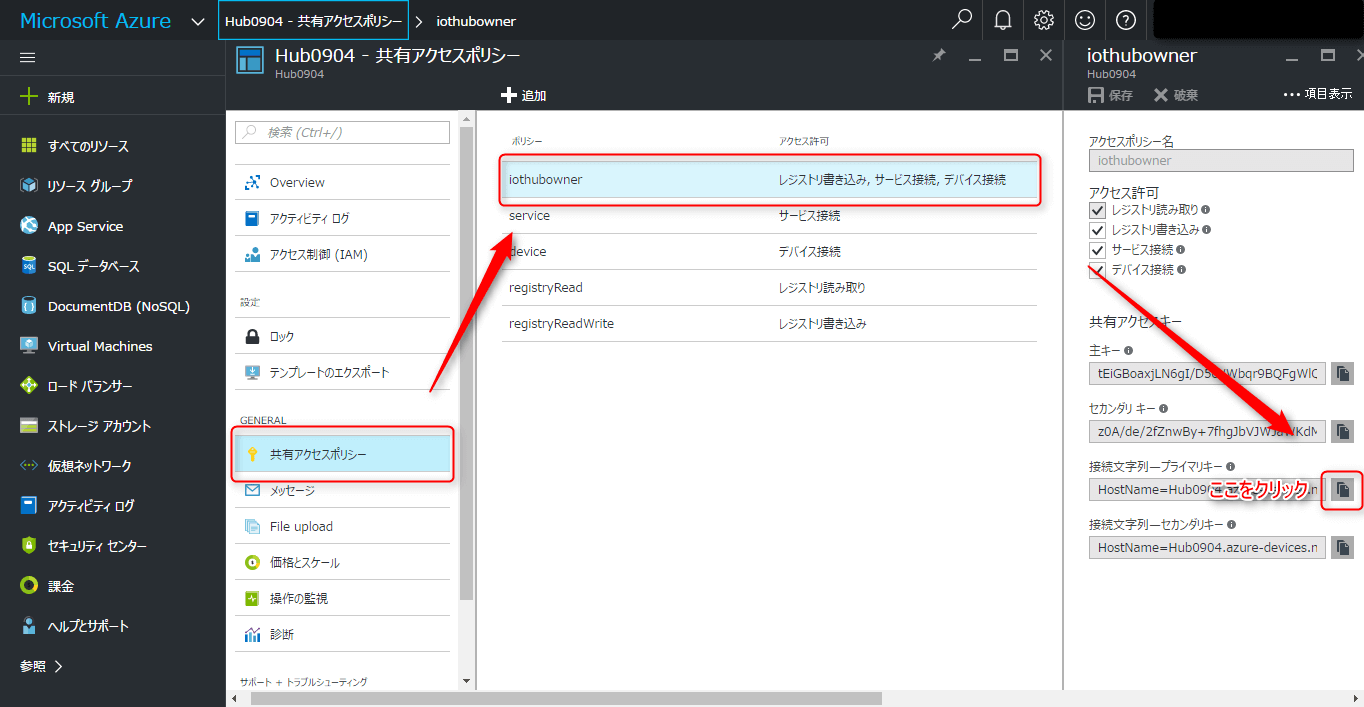 共有アクセスポリシーからiothubownerをクリックし、プライマリキーをコピーします。