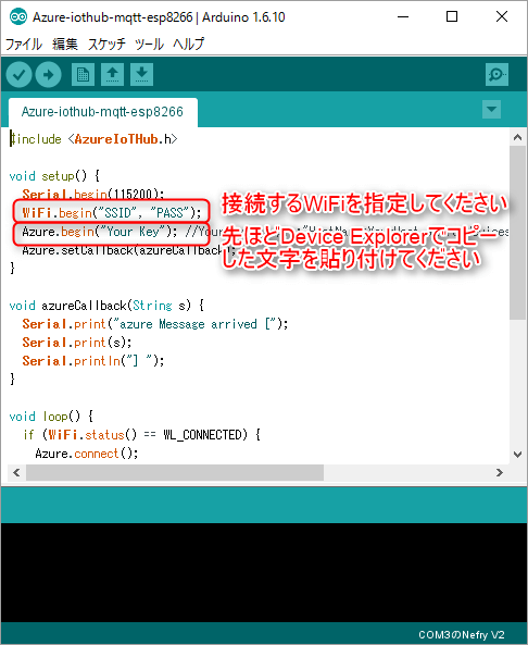 Azure.beginには、先ほどDevice Explorerで取得したキーを張り付けてください。