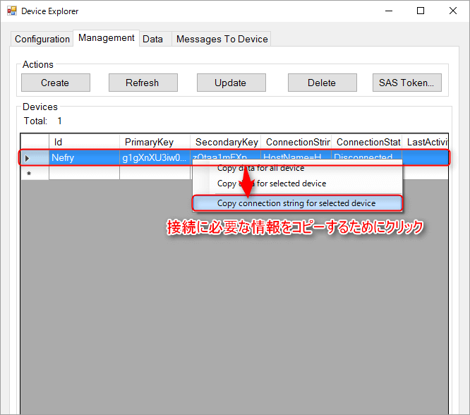 今回作成したDevice IDをクリックすると青色の欄が移動しますので、選択された状態で右クリックするとCopy connection string for selected deviceを選んでクリックしてください。