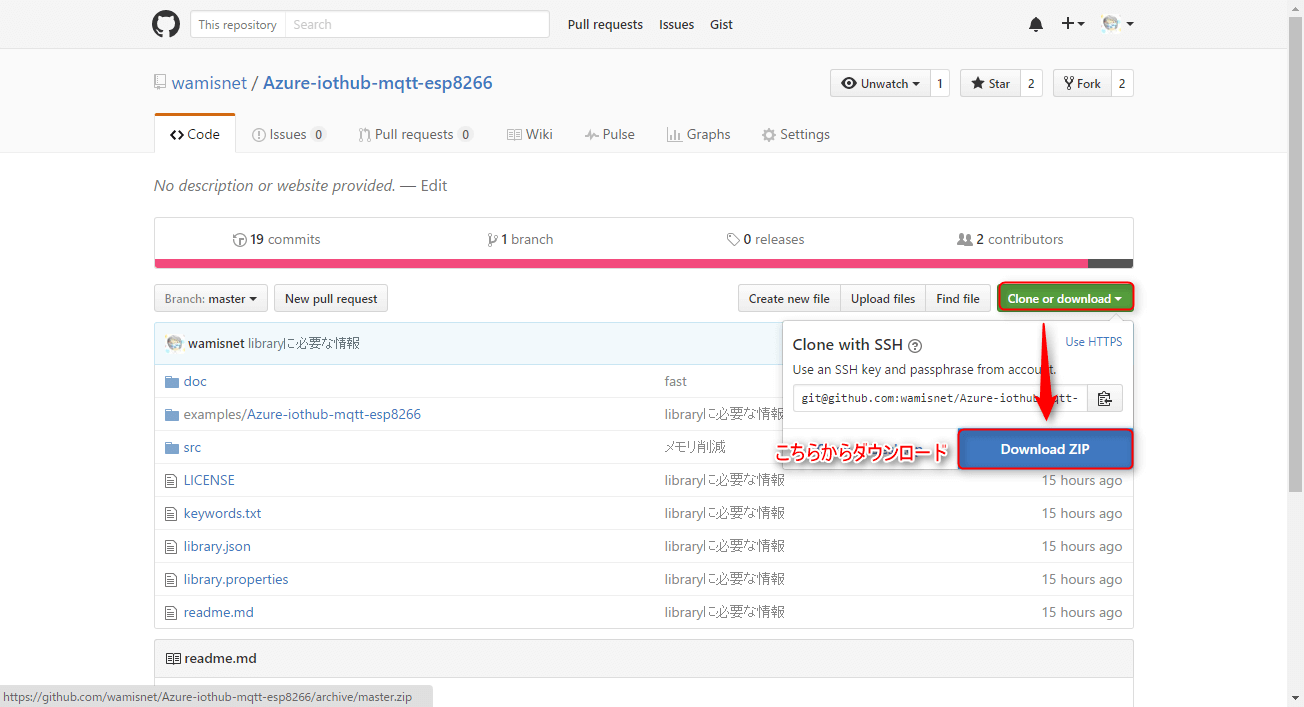 それでは、AzureIoTHubライブラリー(https://github.com/wamisnet/Azure-iothub-mqtt-esp8266) をこちらのリンクから移動して写真を参考にZipでダウンロードしてください。
