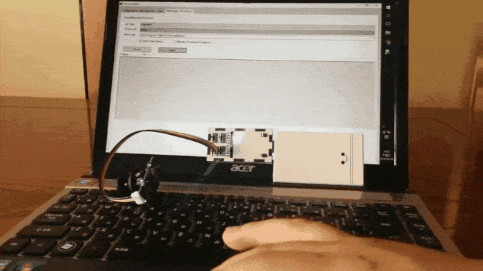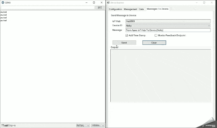 これはAzureIoTHub(Device explorer)からNefry(ESP8266が中に入ってる)へデータを送っています。届いたときにLEDが点滅するようになっています。