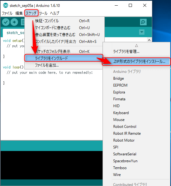 ダウンロード終わりましたら、ArduinoIDEを開いてスケッチ→ライブラリーをインクルード→.zip形式のライブラリーをインストールをクリックし、先ほどダウンロードしたファイルを選んでください。そうすると自動的にライブラリーのインストールが始まります。